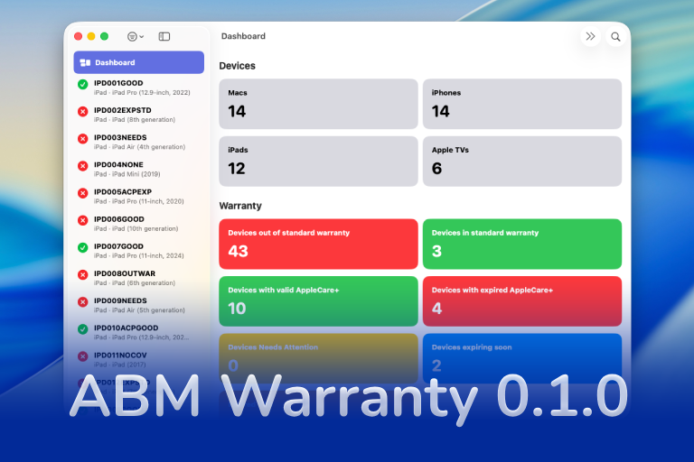 Introducing ABM Warranty for macOS A smarter, faster way to understand and manage warranty coverage across your organization. If you manage Apple devices at scale, you already know that Apple Business Manager (ABM) provides warranty data — but in practice, it’s extremely limited. It doesn’t provide workflow-friendly insights, it doesn’t surface actionable coverage states, and it doesn’t help you wrangle the ever-growing complexity of AppleCare+ renewals across hundreds or thousands of devices. That gap is exactly why I built ABM Warranty, a new macOS app — now available in the...